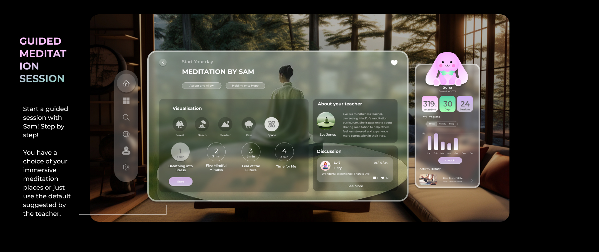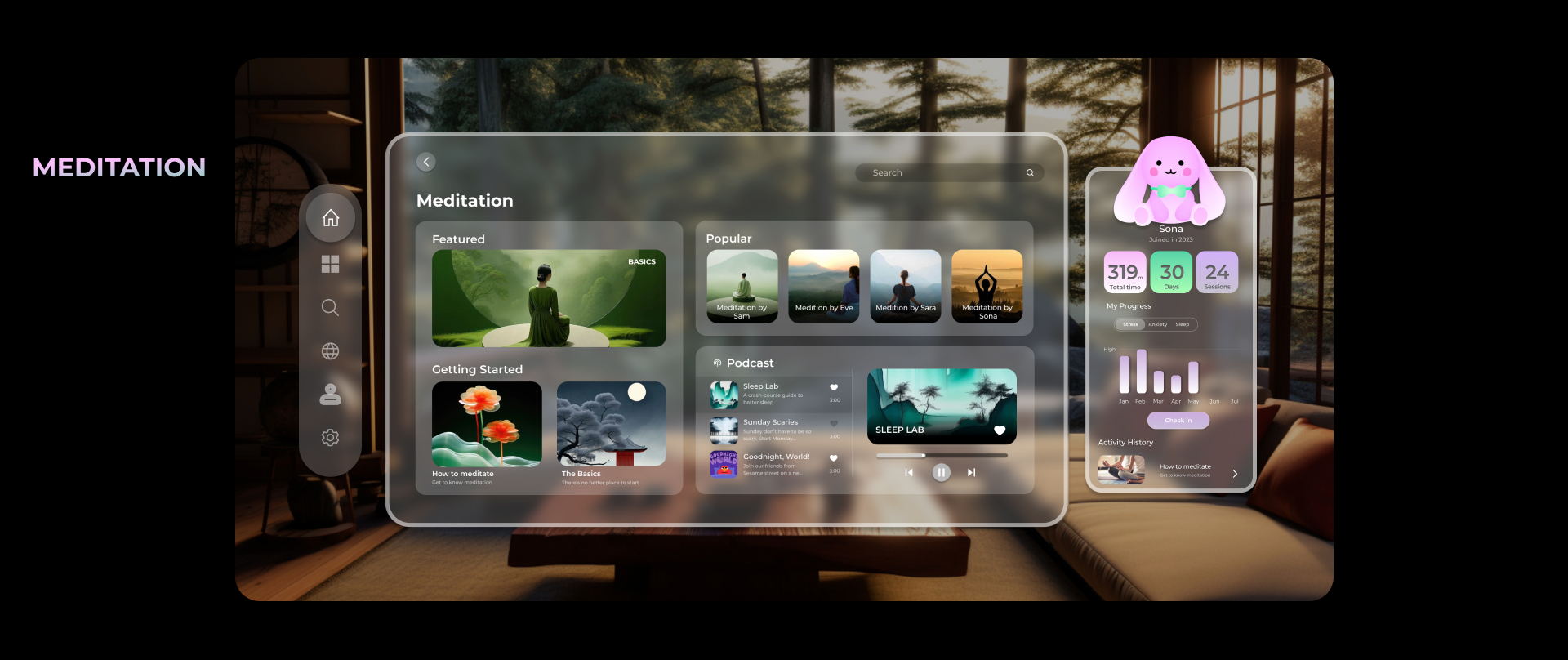 With limited equipment, I tried to create a apple vision pro UI for a meditation management tool with immersive experience using Figma and Spline.